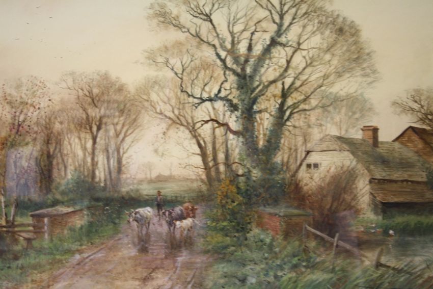 HENRY CHARLES FOX (1860-1925). Rural wooded landscape with drover and cattle in a lane before a farmstead, signed and dated 1919 lower right, watercolour, framed and glazed, 53 x 74 cm