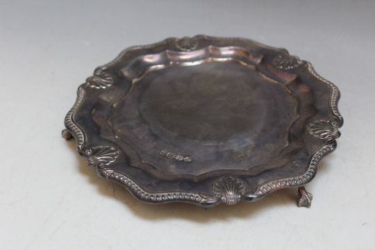 A HALLMARKED SILVER CARD TRAY BY CARR'S OF SHEFFIELD - SHEFFIELD 1992, on ball and claw feet, approx weight 340g, Dia 20.5 cm