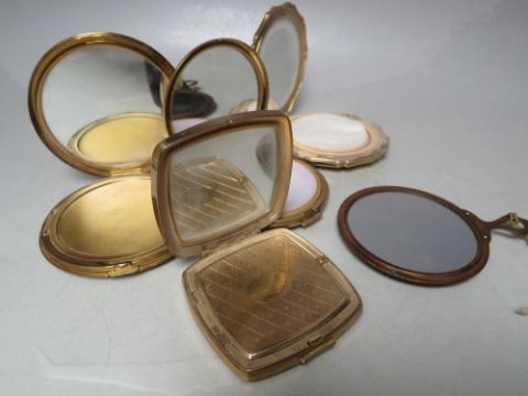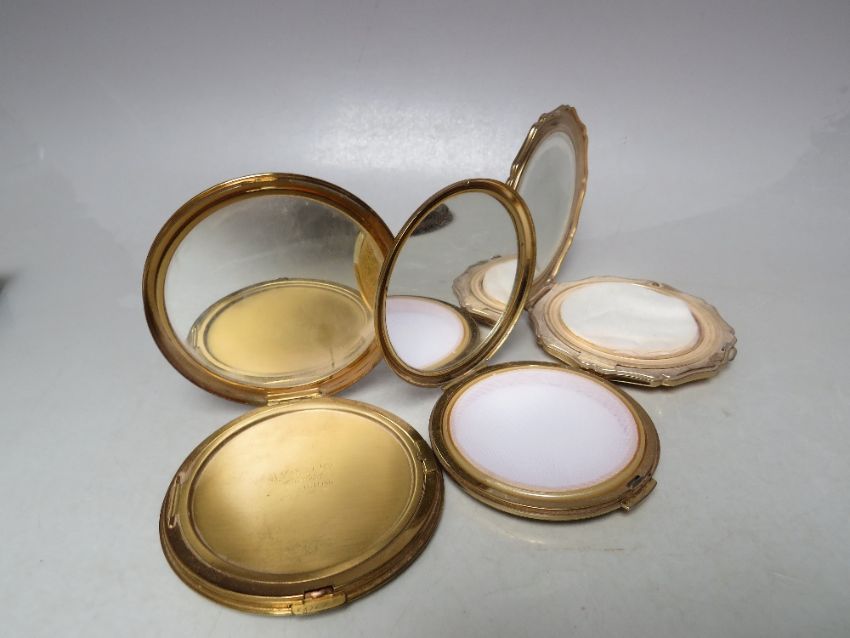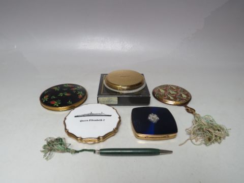 FOUR VINTAGE LADIES POWDER COMPACTS, comprising a Regent of London compact with blue enamel lid and marcasite set mount, a Vogue Garnties compact with red roses to lid, a QE2 rosette shaped compact by Stratton and a boxed yellow metal compact also by Stratton, together with a Gwenda hand held mirror etc. (6)