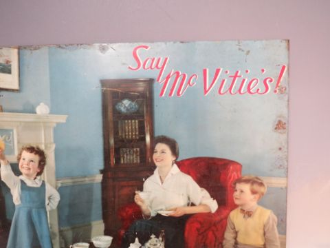 A VINTAGE METAL FRONTED 'SAY McVITIE'S!' ADVERTISING / SHOP DISPLAY SIGN, approximately 47.5 cm x 36.5 cm, together with two vintage Everywoman magazine advertising signs (3)