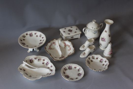 A COLLECTION OF ROYAL ALBERT 'SWEET VIOLETS' PATTERN DECORATIVE BONE CHINA, to include a shell shaped dish and small comport H 7.5 cm D 16 cm, together with retail division conference bud vase in the form of a s 'pottery chimney', H 9.5 cm, etc. (11)
