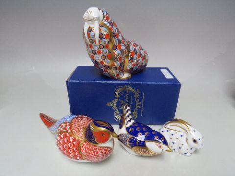 A COLLECTION OF ROYAL CROWN DERBY PAPERWEIGHTS, comprising a boxed Walrus - silver stopper, a rabbit - silver stopper, an Imari pheasant and a wren - both lacking stoppers (4)