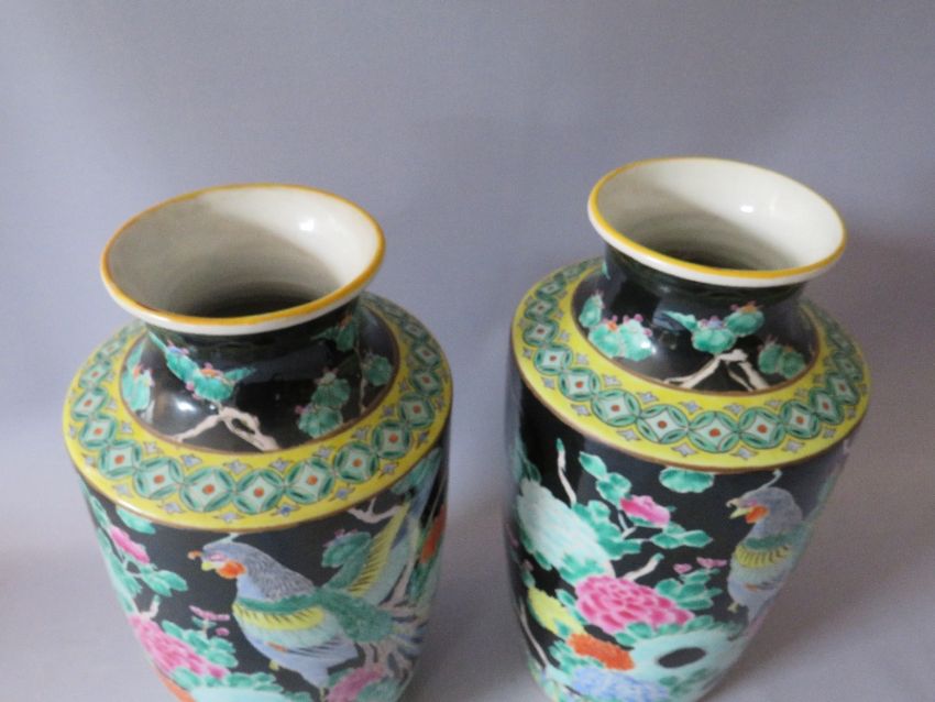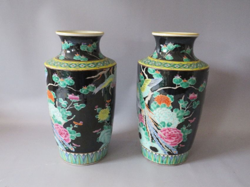 A PAIR OF ORIENTAL HIGH SHOULDERED FAMILLE NOIR VASES, having character marks to base, H 30 cm