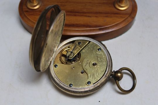 A 'TELL' CENTRE SECONDS POCKET WATCH CHRONOMETER ON STAND, H 13 cm