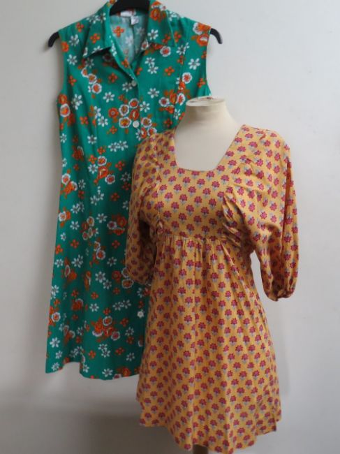 A COLLECTION OF LADIES VINTAGE CLOTHING, various styles and periods, to include three vintage skirts new with tags by Tergal and Fides of Paris, a 1980 Frank Usher drop waist blouse, a Jinty polka dot day dress size 12, a Selfridges sheer tie front blouse, and a Lee Bender for Bus top short patterned dress etc (11)