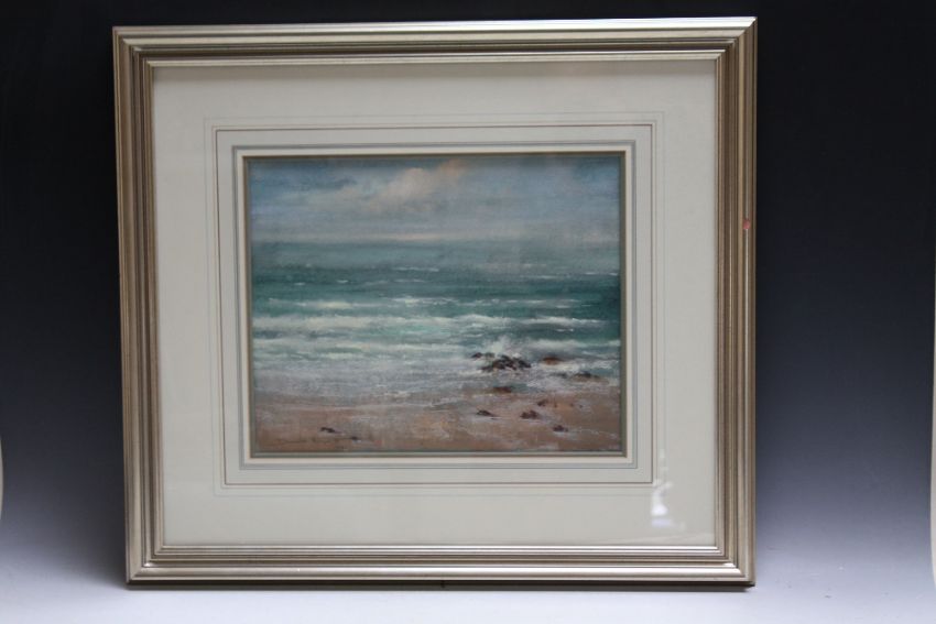 AN ATMOSPHERIC COASTAL BEACH SCENE WITH HALCYON GALLERY LABEL VERSO, indistinctly signed and dated 19?3 lower left, mixed media on paper, framed and glazed 31 x 39 cm