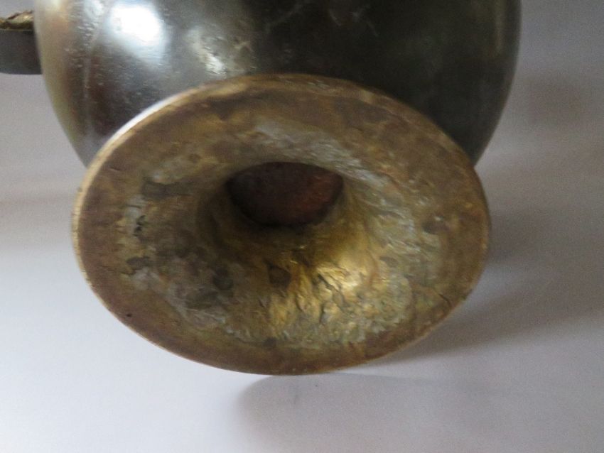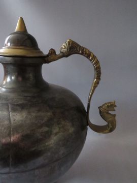 A LARGE VINTAGE EASTERN METAL DECORATIVE KETTLE / POURING VESSEL, with applied mask embellished handle and spout, H 44 cm, W 46 cm