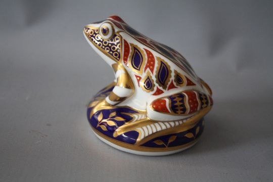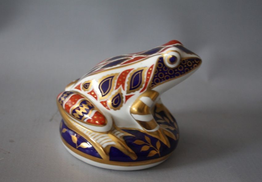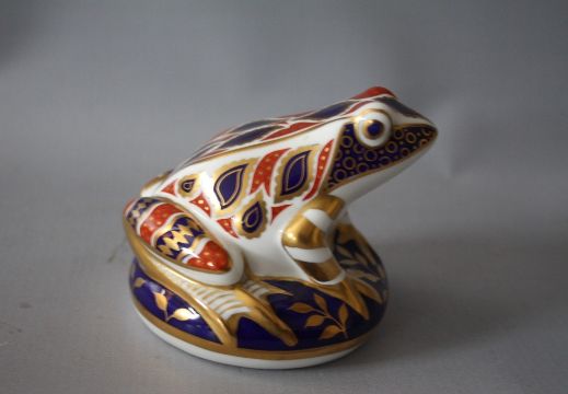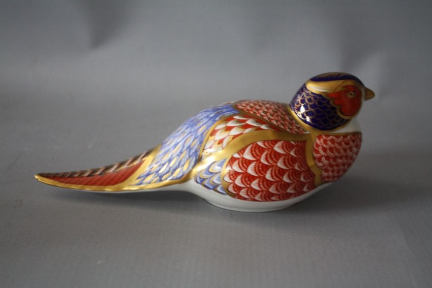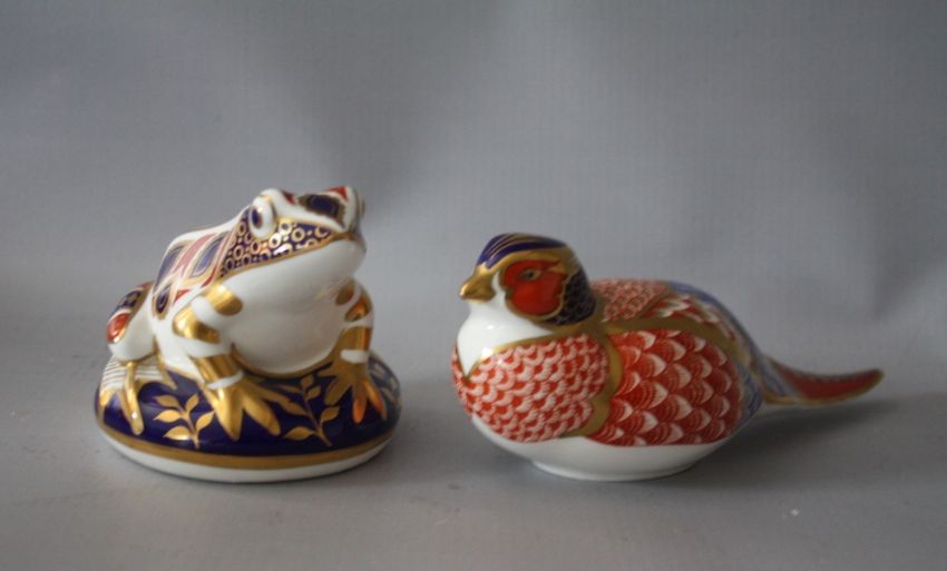 A ROYAL CROWN DERBY IMARI PATTERN PHEASANT PAPERWEIGHT, together with a Royal Crown Derby Imari pattern frog paperweight, both with silver stoppers (2)