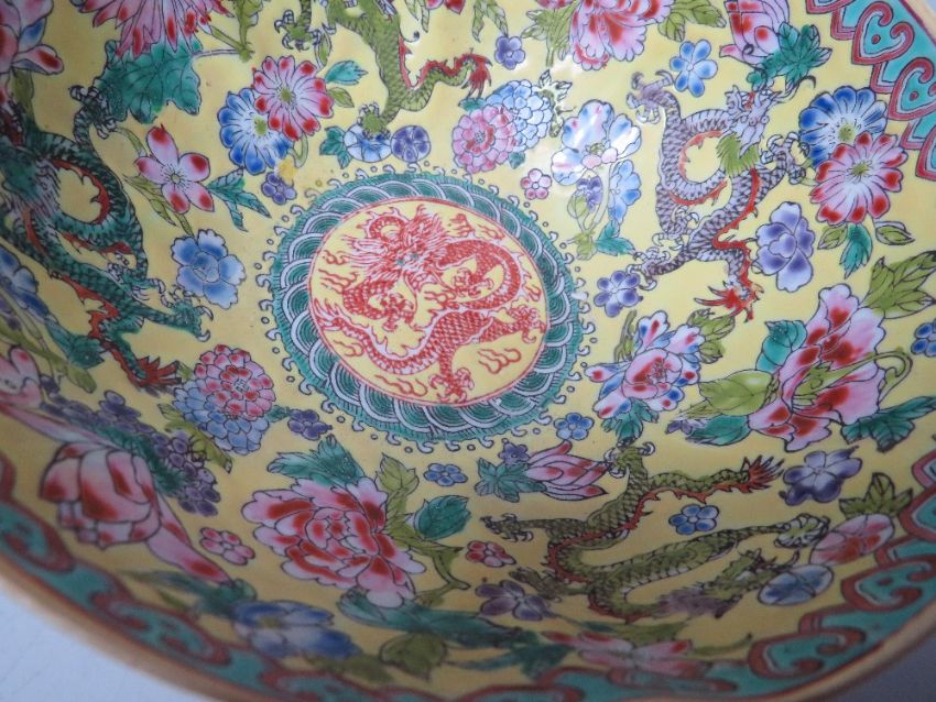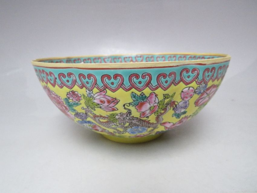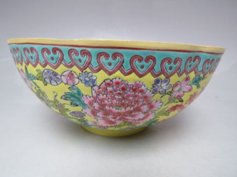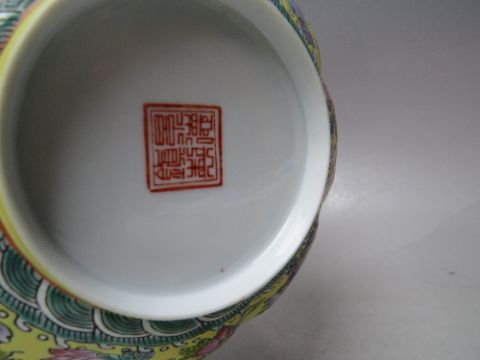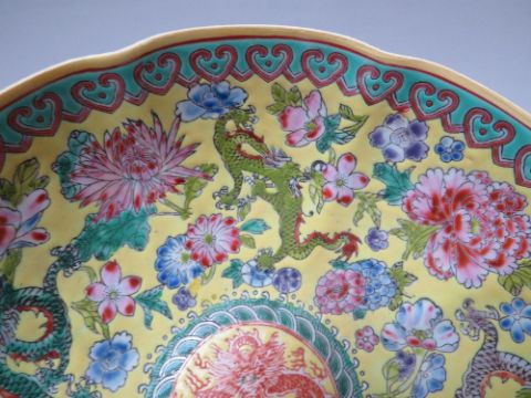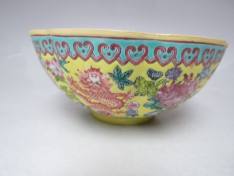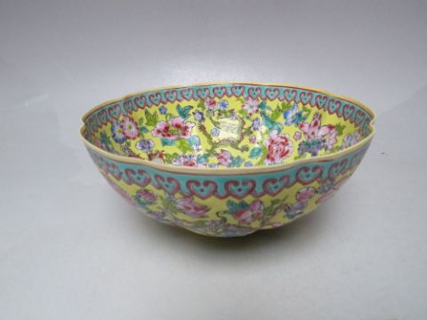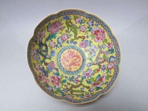 A CHINESE FINE PORCELAIN IMPERIAL YELLOW FAMILLE ROSE SCALLOPED BOWL, profusely decorated with floral and mythical dragon figures to the interior and exterior, four character mark to base, Dia. 16.5 cm