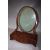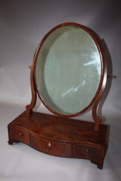 A REGENCY MAHOGANY AN INLAID DRESSING MIRROR, the oval mirror held by shaped supports and a serpentine shaped base with three drawers, H 55 cm, W 45 cm