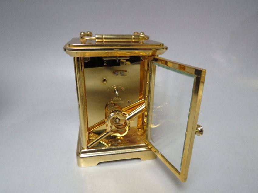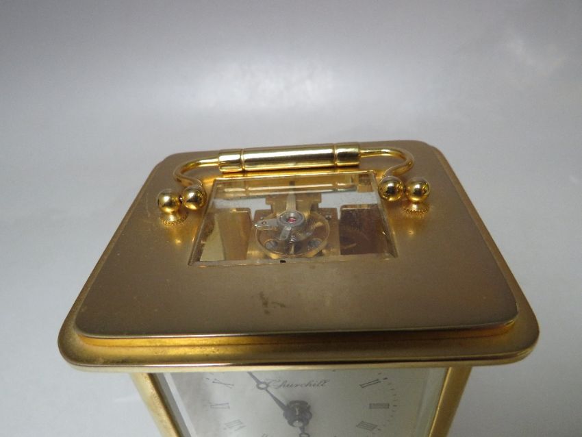 A MODERN LEATHER CASED BRASS 'CHURCHILL' CARRIAGE CLOCK, one glass panel damaged, with key, clock H 14 cm, W 8 cm,, D 7 cm