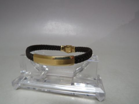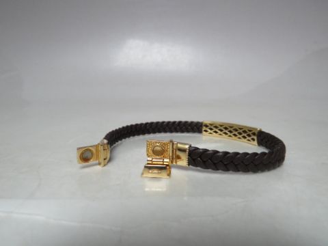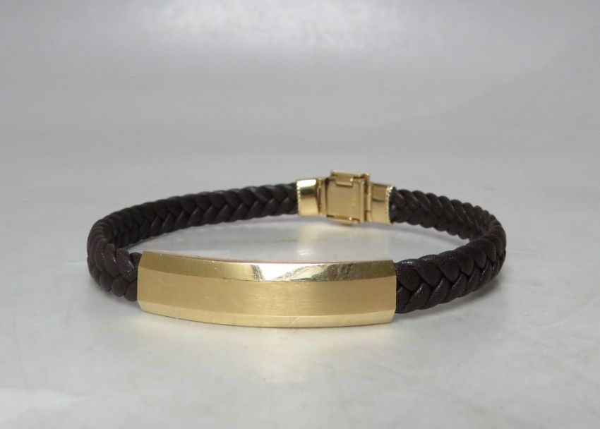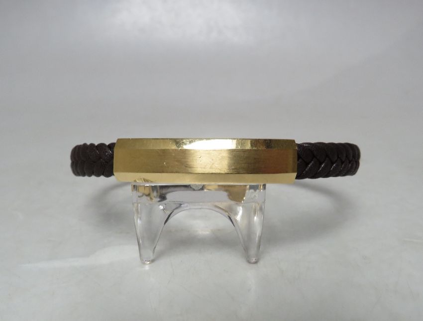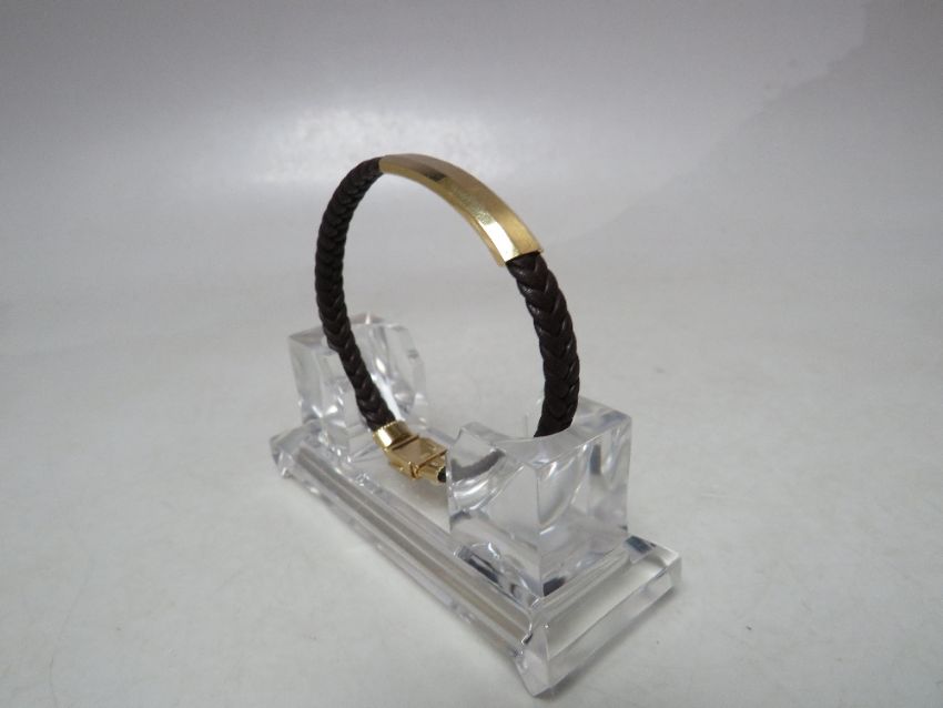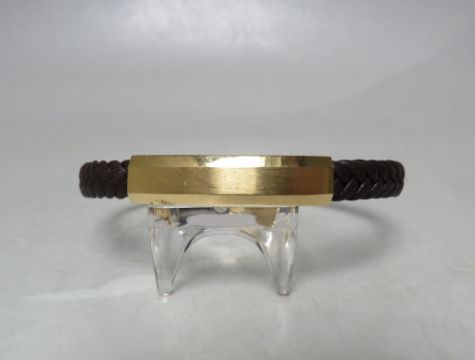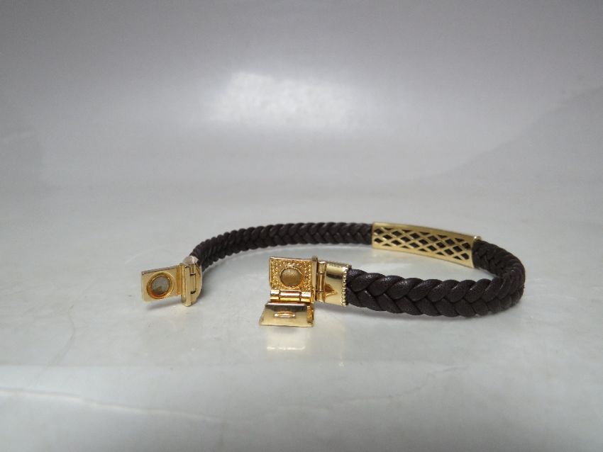 A DESIGNER STYLE YELLOW METAL AND PLAITED LEATHER BRACELET, stamped 18K to magnetic / hinged fastening clasp, overall L 21 cm