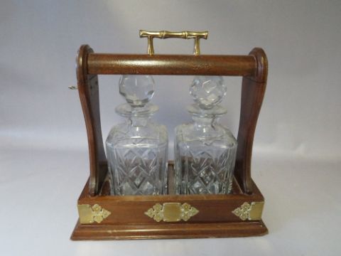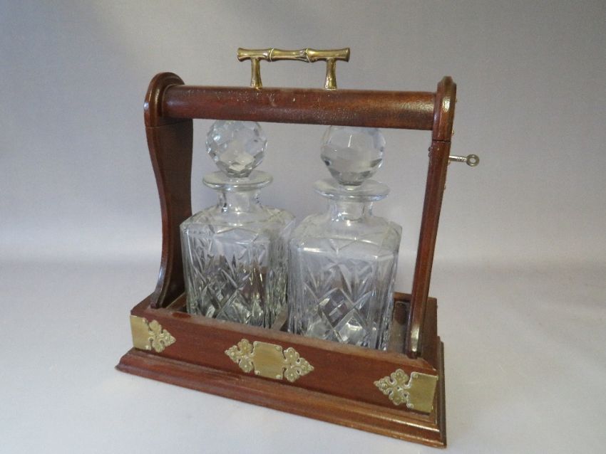 A TWENTIETH CENTURY MAHOGANY TWO DECANTER TANTALUS, with key, W 33 D 17 H 30 cm