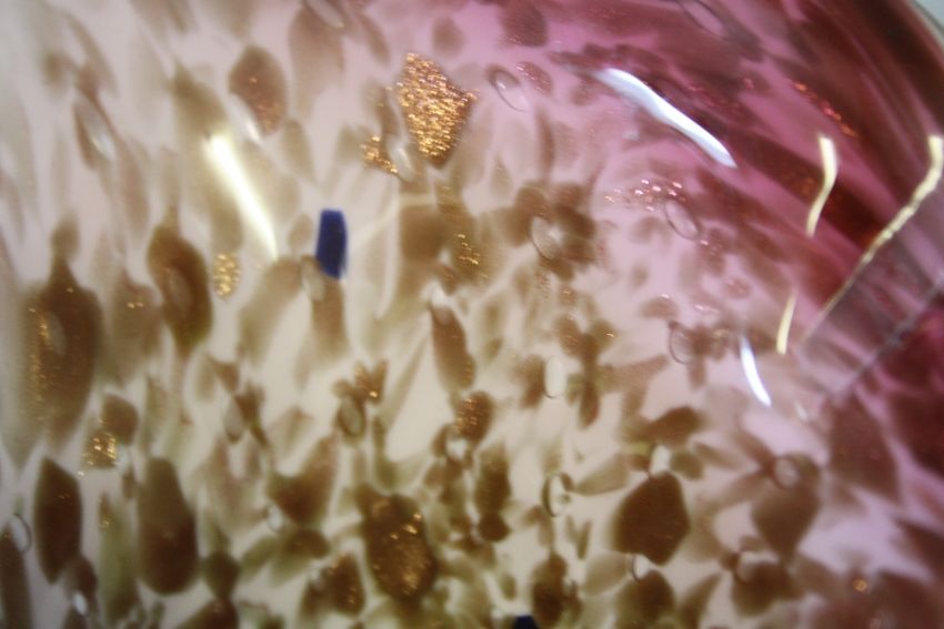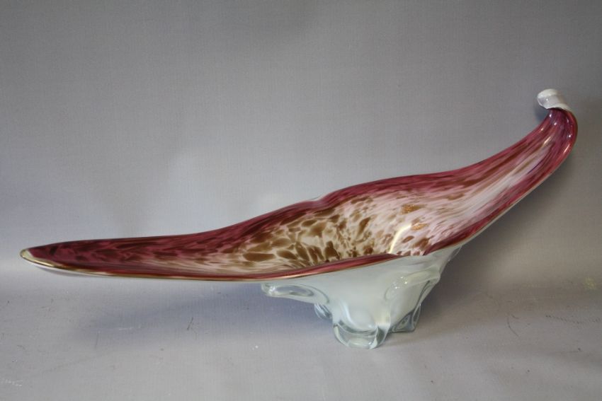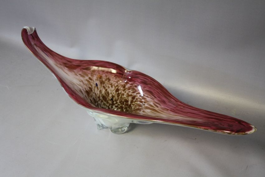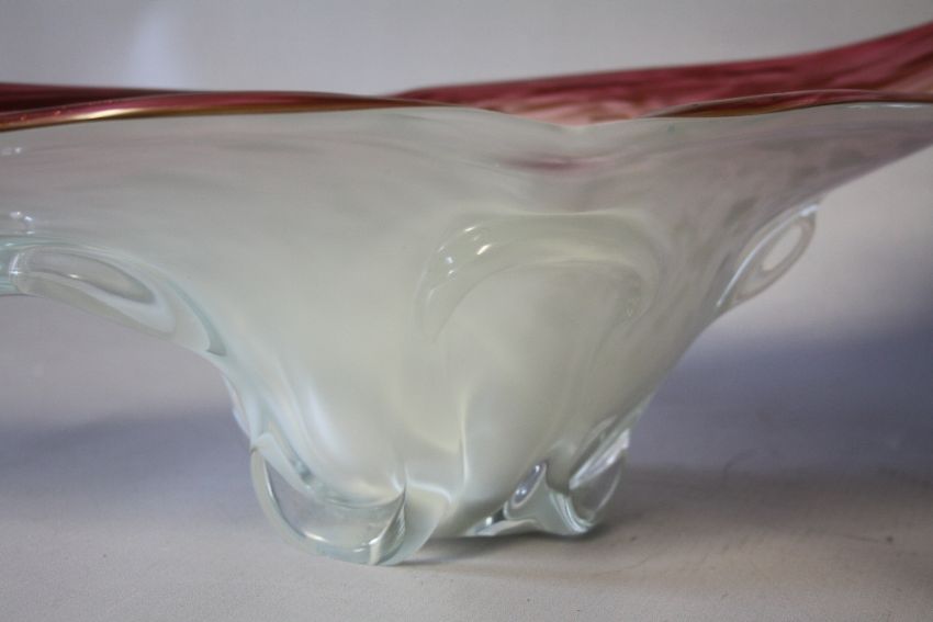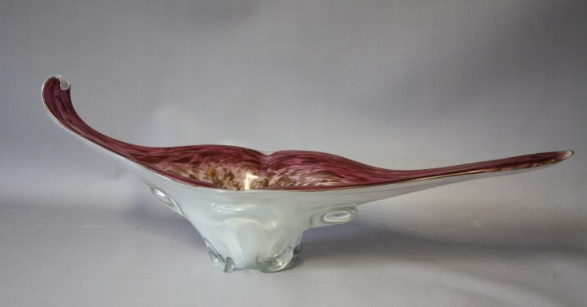 A LARGE MURANO STYLE FREEFORM STUDIO GLASS BOWL, graduating pink, white and clear cased glass with copper aventurine patches, L 57 cm