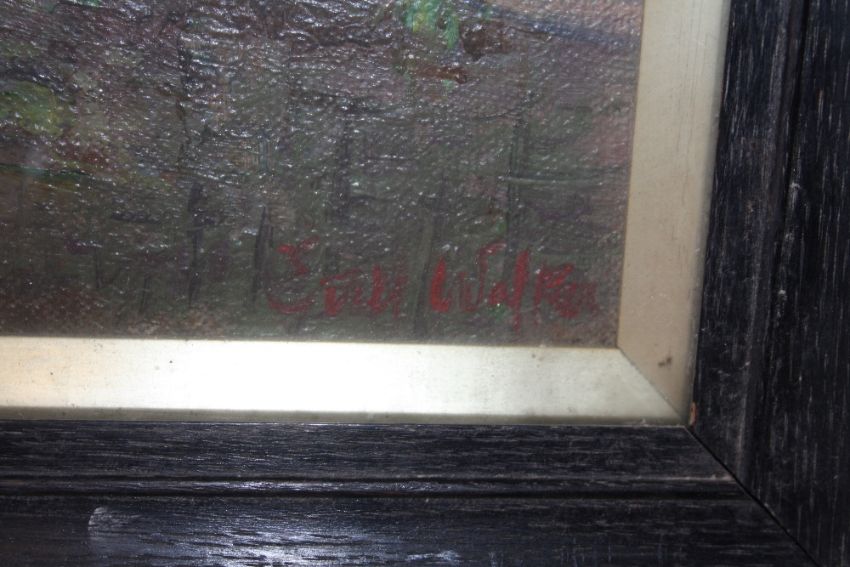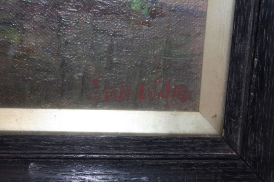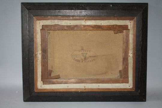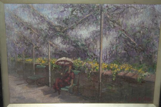 (XIX-XX). Ornamental garden scene with seated figure, indistinctly signed lower right, oil on canvas, framed and glazed, 24 x 34 cm
