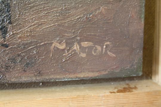 MAJOR. An impressionist stormy evening wooded landscape with figures on path, signed lower right, oil on canvas, framed 43 x 61 cm