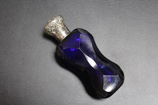 A BRISTOL BLUE GLASS STYLE SCENT BOTTLE, with tapering 'waist', H 8.5 cm
