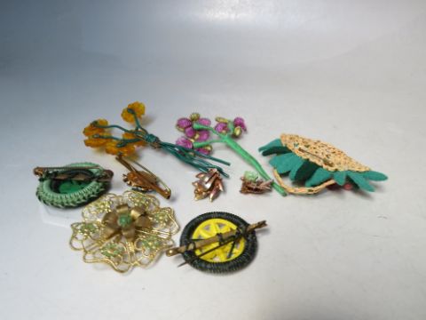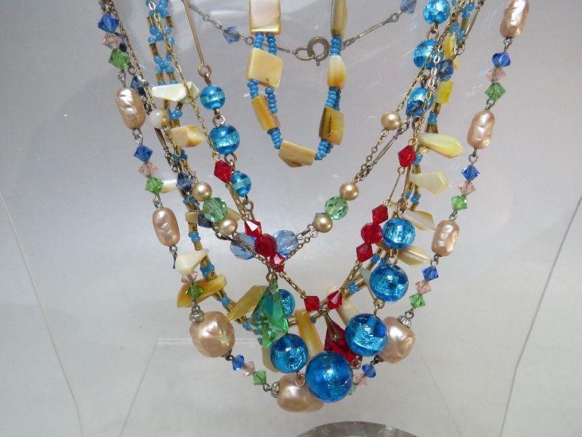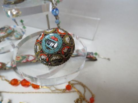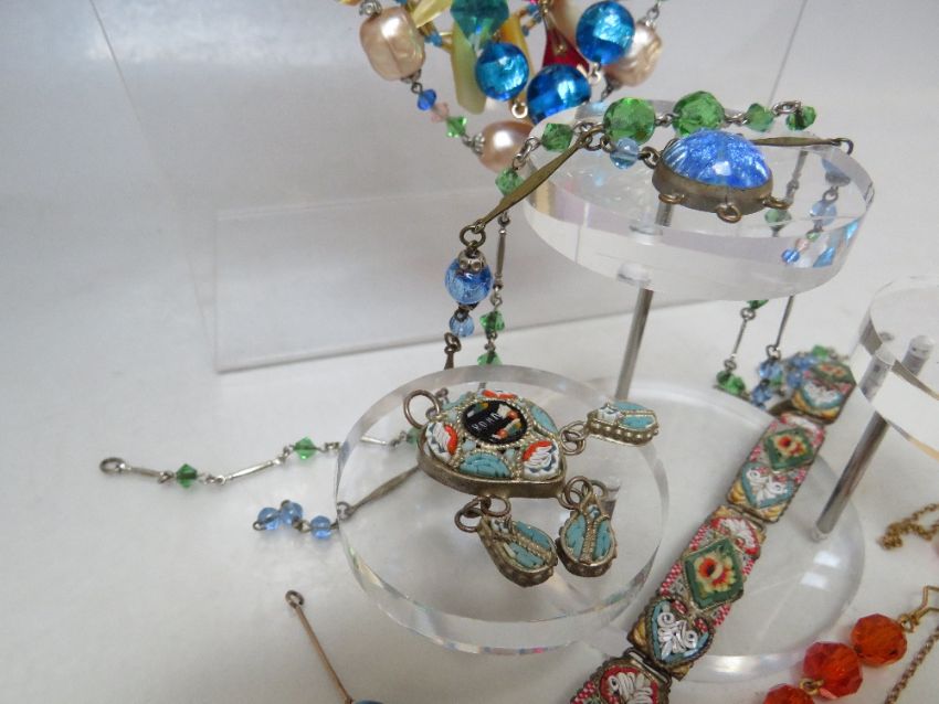 A COLLECTION OF VINTAGE COSTUME JEWELLERY, comprising a selection of bead necklaces to include a foiled example, three items of Italian micro mosaic jewellery and a selection of retro and bespoke brooches etc. (Approx. 21)