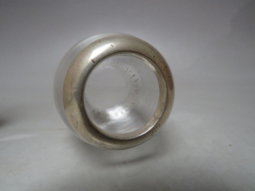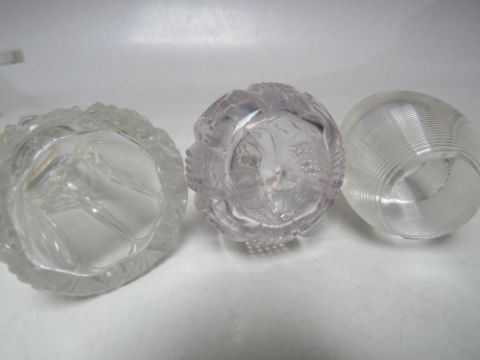 AN EARLY 20TH CENTURY SILVER MOUNTED RIBBED GLASS MATCH STRIKE, H 5 cm, together with two silver collared / lidded vanity jars (3)