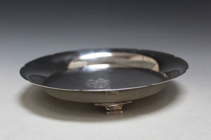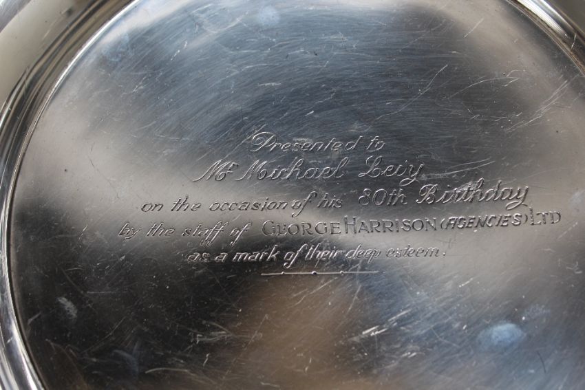 A HALLMARKED SILVER FOOTED DISH - LONDON 1944, having presentation inscription, approx weight 500g, Dia 22.75 cm