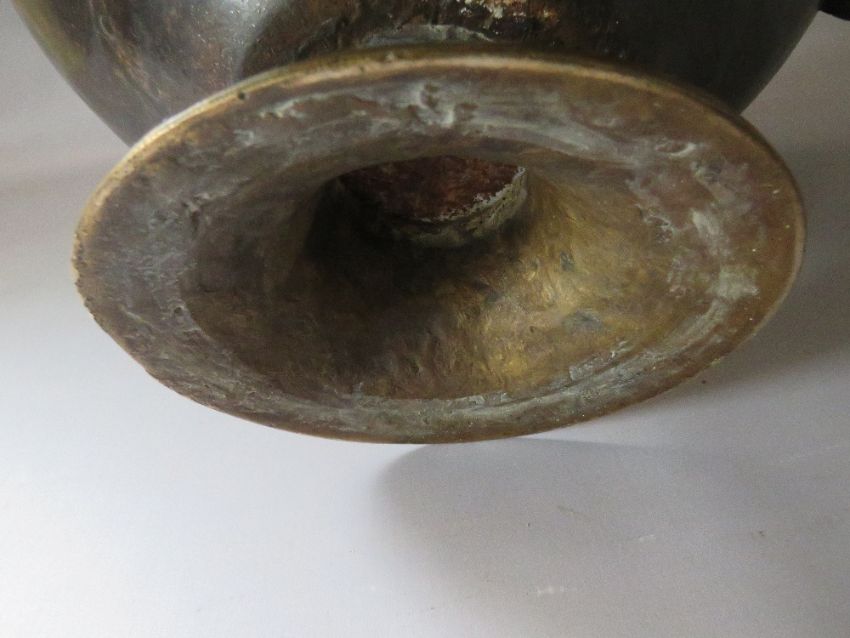 A LARGE VINTAGE EASTERN METAL DECORATIVE LIDDED VESSEL, with applied mask embellished handles, H 45 cm, W 52 cm