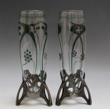 A PAIR OF WMF ART NOUVEAU STYLE SPECIMEN VASES, having separate WMF stamped stands and fitted tapering glass vases with green decoration, H 18.5 cm