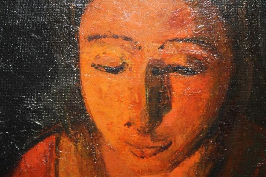 (XX). Continental school portrait study of a seated mother and child, indistinctly signed upper right, oil on canvas, unframed, 76 x 56 cm