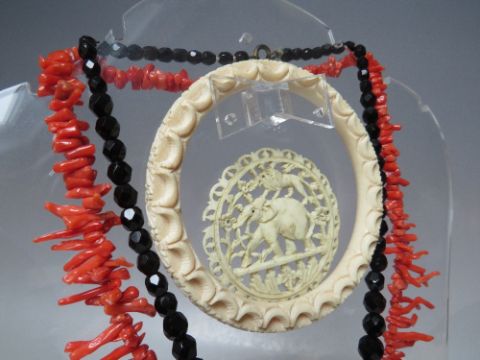 A VINTAGE CORAL STRAND NECKLACE, L 48 cm, together with a Victorian jet brooch, a single graduated strand of faceted jet type beads and a carved bangle etc. (5)