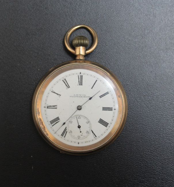 A WALTHAM GOLD PLATED OPEN FACED MANUAL WIND WRIST WATCH, A/F, Dia 4.75 cm