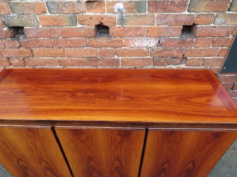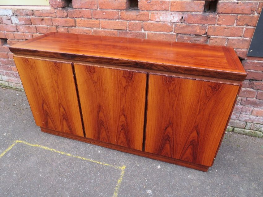 A MID 20TH CENTURY DANISH SKOVBY MOBELFABRIK SIDEBOARD, three hinged opening doors, the left hand cupboard with five interior drawers, silver / green label to reverse, H 84 cm, W 153 cm, D 48 cm