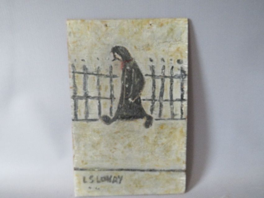 AFTER LAURENCE STEPHEN LOWRY (1887-1976). Street scene with solitary figure walking by railing, bears signature lower left, oil on board, unframed, 25 x 16 cm