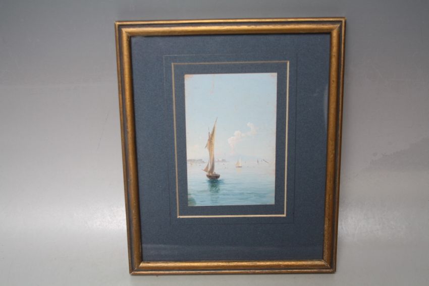 CIRCLE OF D'ESPOSITO (XIX/XX). Bay of Naples scene with sailing vessels, Vesuvius in background, unsigned, gouache on paper, framed and glazed, 12 x 8 cm