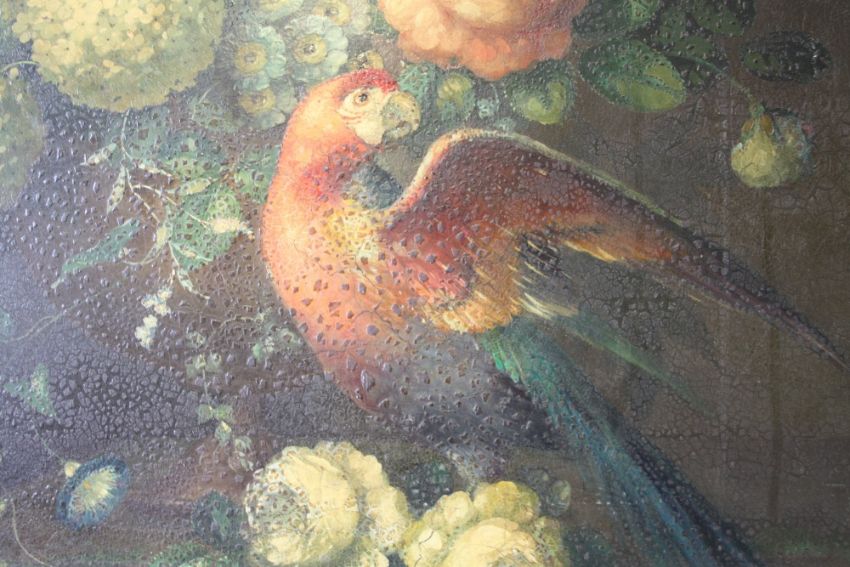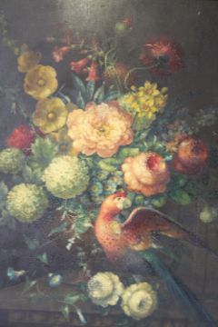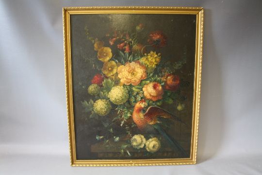 (XX). Still life study of flowers and a parrot on a marble table, unsigned, oil on board, framed, 73 x 60 cm