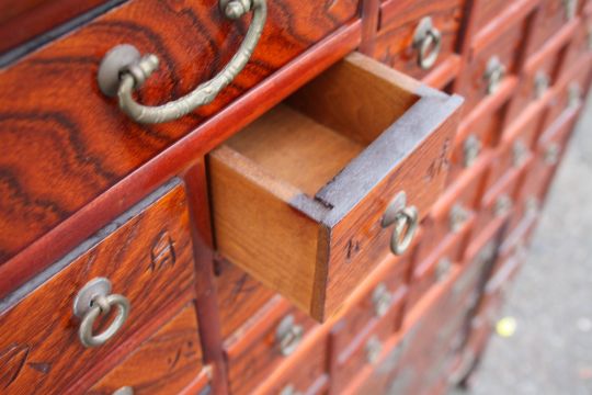 A CHINESE HARDWOOD APOTHECARY CHEST OF SLIM PROPORTIONS, having an arrangement of forty four drawers and two door cabinet, with ring turned handles and copper mounts, each drawer with incised Chinese marks, H 94.5 W 76 D 24 cm