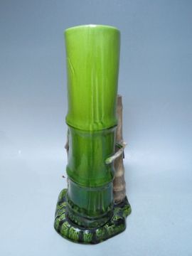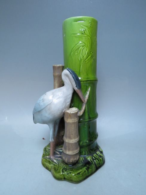 A PAIR ANTIQUE ENGLISH BRETBY MAJOLICA POTTERY AESTHETIC BAMBOO HERON BIRD VASES, impressed marks to base, H 30 cm, S/D