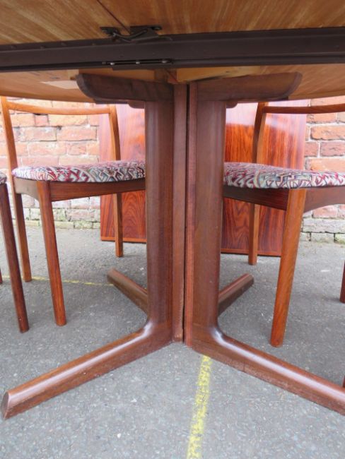 A MID 20TH CENTURY DANISH NIELS O. MOLLER FOR GUDME MOBELFABRIK CIRCULAR DINING TABLE AND EIGHT CHAIRS, the table with crossbanding to the edges extending with two additional leaves, stamped to the underside, table H 70 cm, Dia. 122 cm, extended L 220 cm