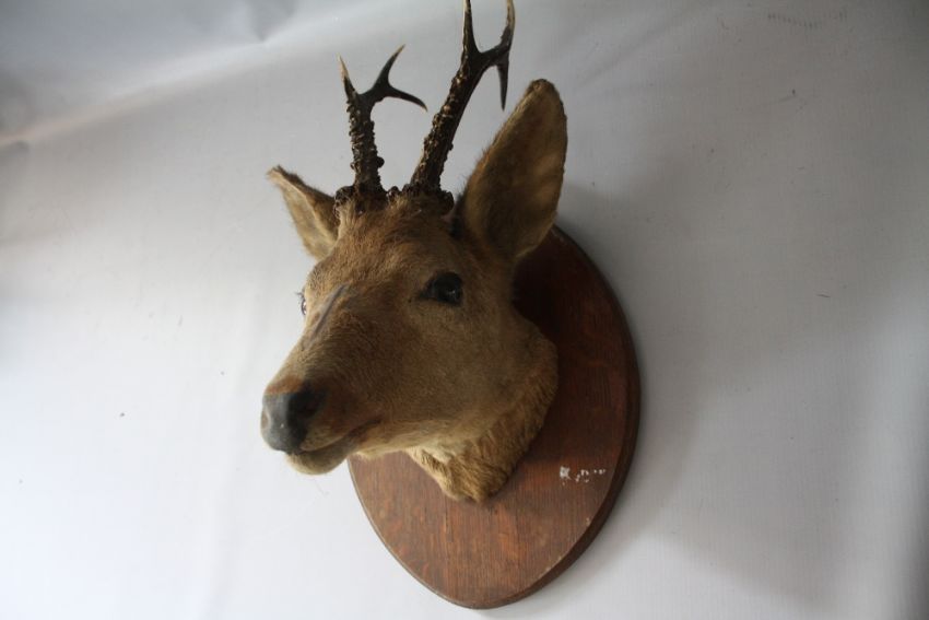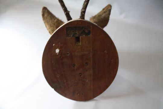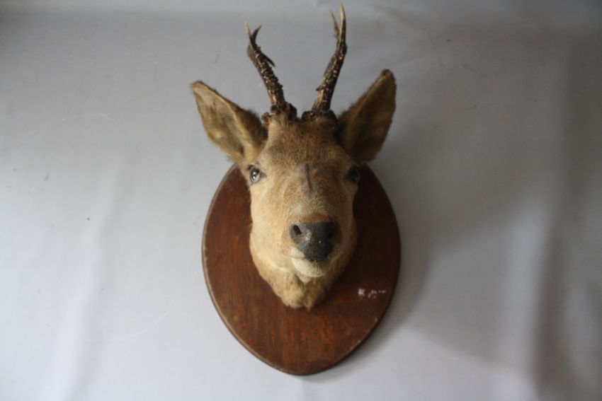 TAXIDERMY - DEER HEAD MOUNTED ON AN OVAL WOODEN PLAQUE , approx. overall H 50 cm
