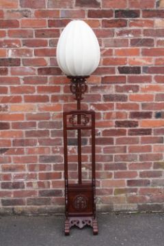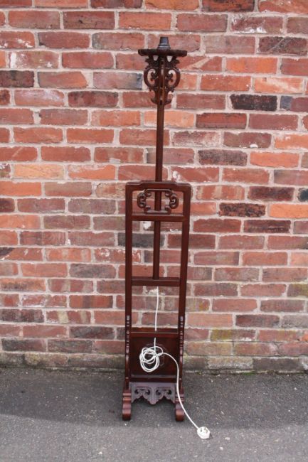 A CHINESE HARDWOOD ADJUSTABLE LAMP STANDARD WITH SHADE, with typical carved and pierced decoration