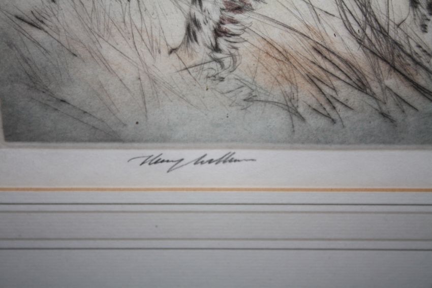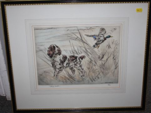 HENRY WILKINSON (1921-2011). Spaniel with duck flying, etching in colours, signed in pencil, No 54/150, framed and glazed, 27 x 35.5 cm