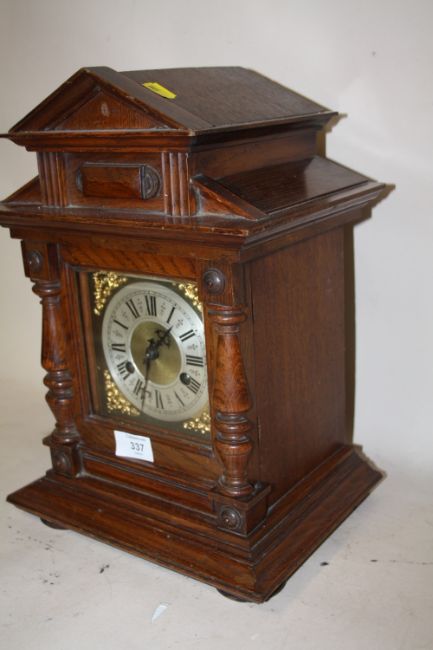 AN ANTIQUE CARVED OAK MANTEL CLOCK, H. 37.5 CM