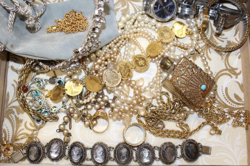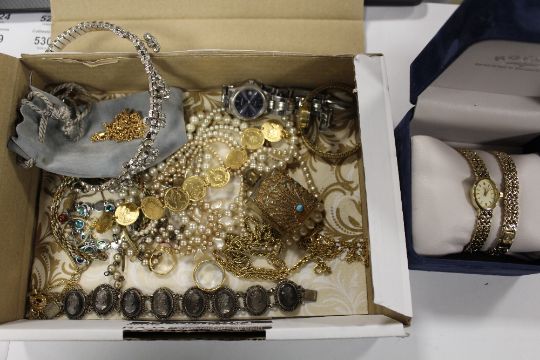 A BOX OF COSTUME JEWELLERY AND WRISTWATCHES TO INCLUDE A ROTARY EXAMPLE, ORNATE SCENT BOTTLE ETC.