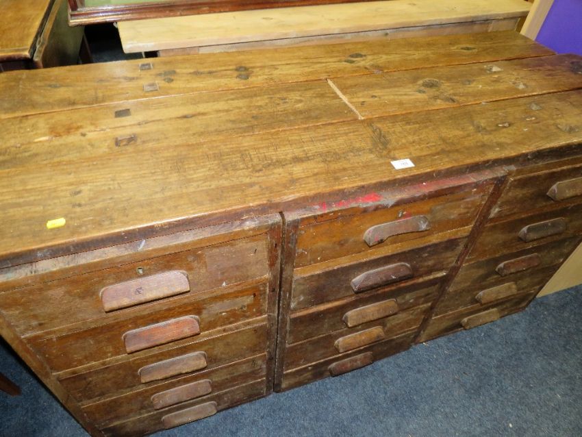 A VINTAGE OAK MULTI DRAWER INDUSTRIAL STYLE BANK OF FIFTEEN DRAWERS WITH RE-CLAIMED TOP H-75 W-144 D-58 CM - A/F
