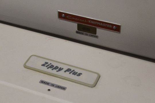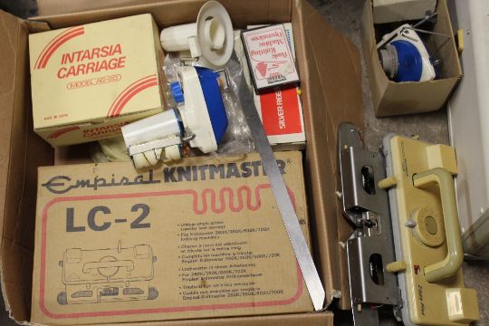 AN EMPIRIAL KNITMASTER F370K TOGETHER WITH A ZIPPY PLUS KNITTING MACHINE WITH STAND AND BOX OF ACCESSORIES