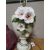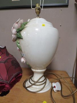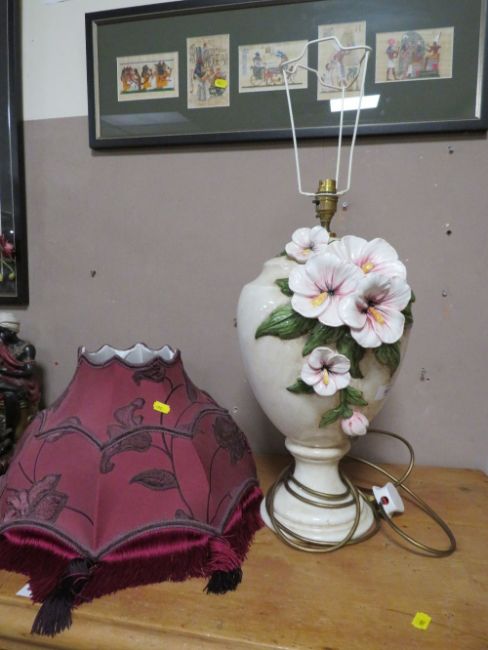 A LARGE CERAMIC TABLE LAMP WITH RED SHADE - OVERALL H-71 CM
