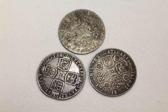 TWO GEORGE II SILVER COINS, TOGETHER WITH A GEORGE III EXAMPLE (3)