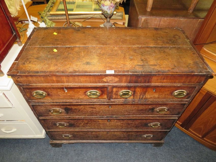 A 19TH CENTURY OAK & MAHOGANY CROSSBANDED FIVE DRAWER CHEST H-97 W-103 CM