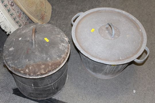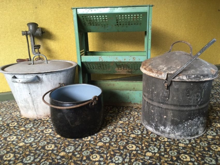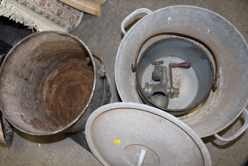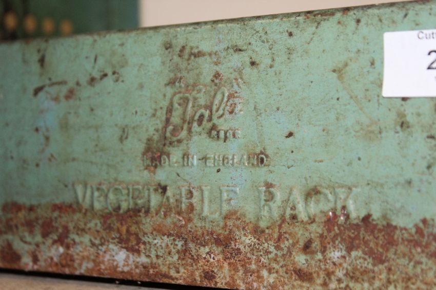 A VINTAGE ENAMELED TALA VEGETABLE RACK TOGETHER WITH TWO VINTAGE METAL LIDDED POTS AND CONTENTS, TO INCLUDE A TABLE MINCER