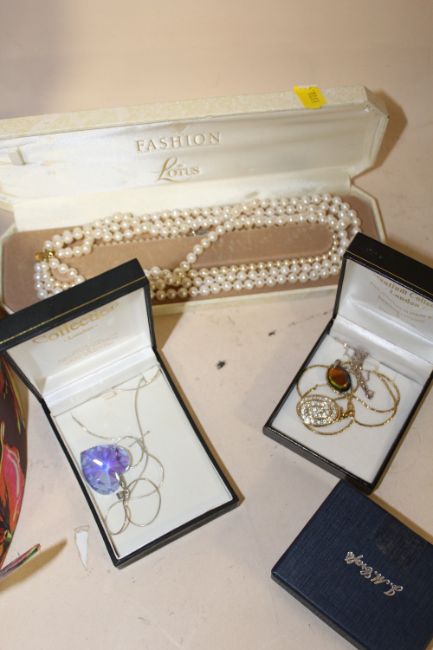 A BOX OF COSTUME JEWELLERY TO INCLUDE VINTAGE BROOCHES, NECKLACES, WATCHES ETC.