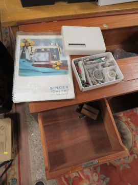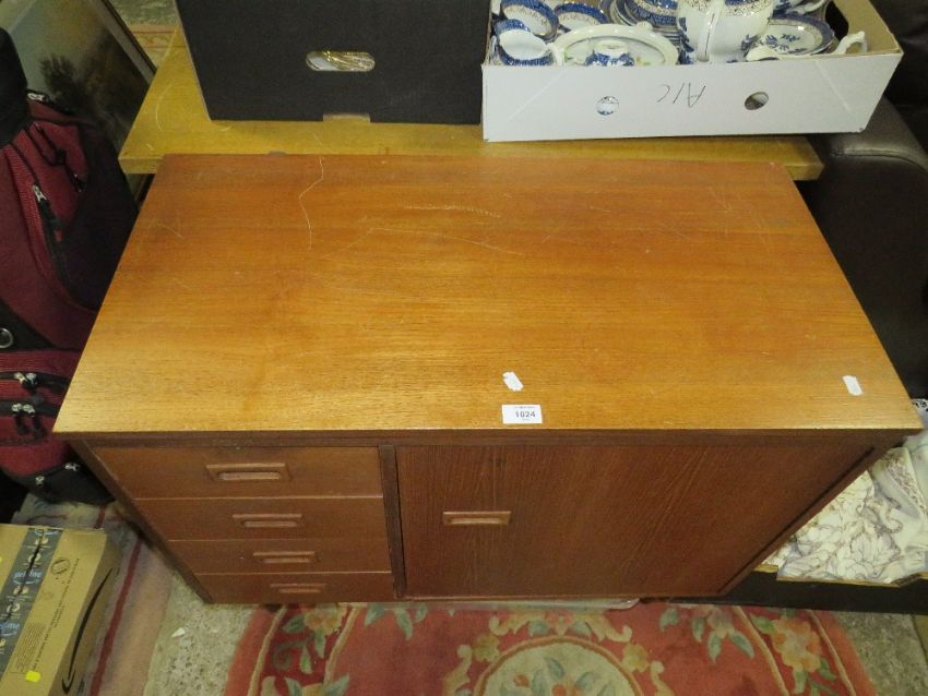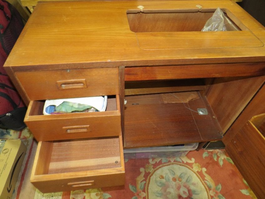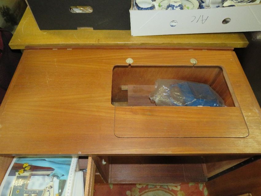 A RETRO TEAK SEWING MACHINE CABINET - NO MACHINE W-86 CM