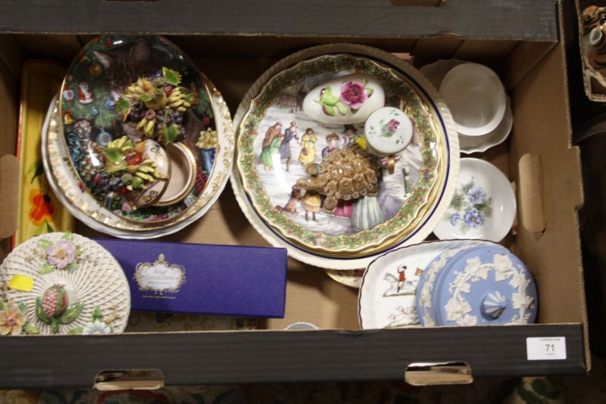 A TRAY OF ASSORTED CERAMICS TO INCLUDE A BOXED ROYAL CROWN DERBY CAKE SLICE, ROYAL ALBERT CABINET PLATES, WEDGWOOD ETC.